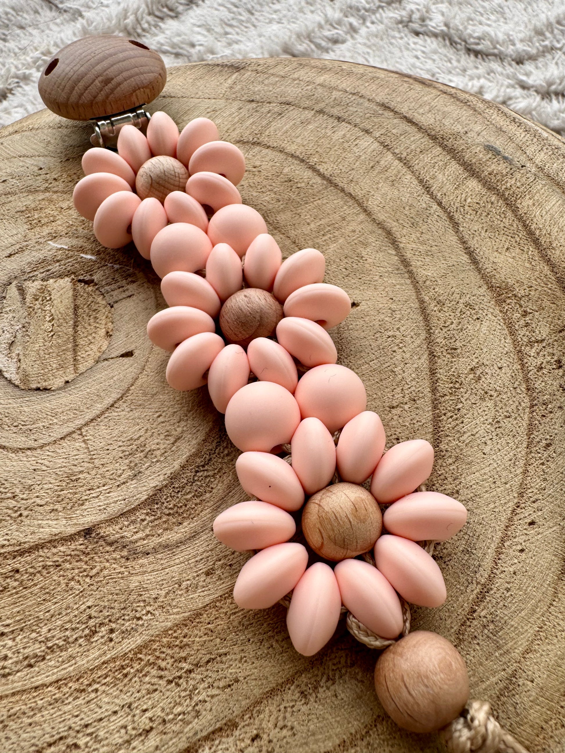 Fabriqué avec des perles en silicone de haute qualité, ce modèle combine des perles plates ainsi que des perles en bois formant une fleur, créant une harmonie de formes et de couleurs qui captivent les sens.