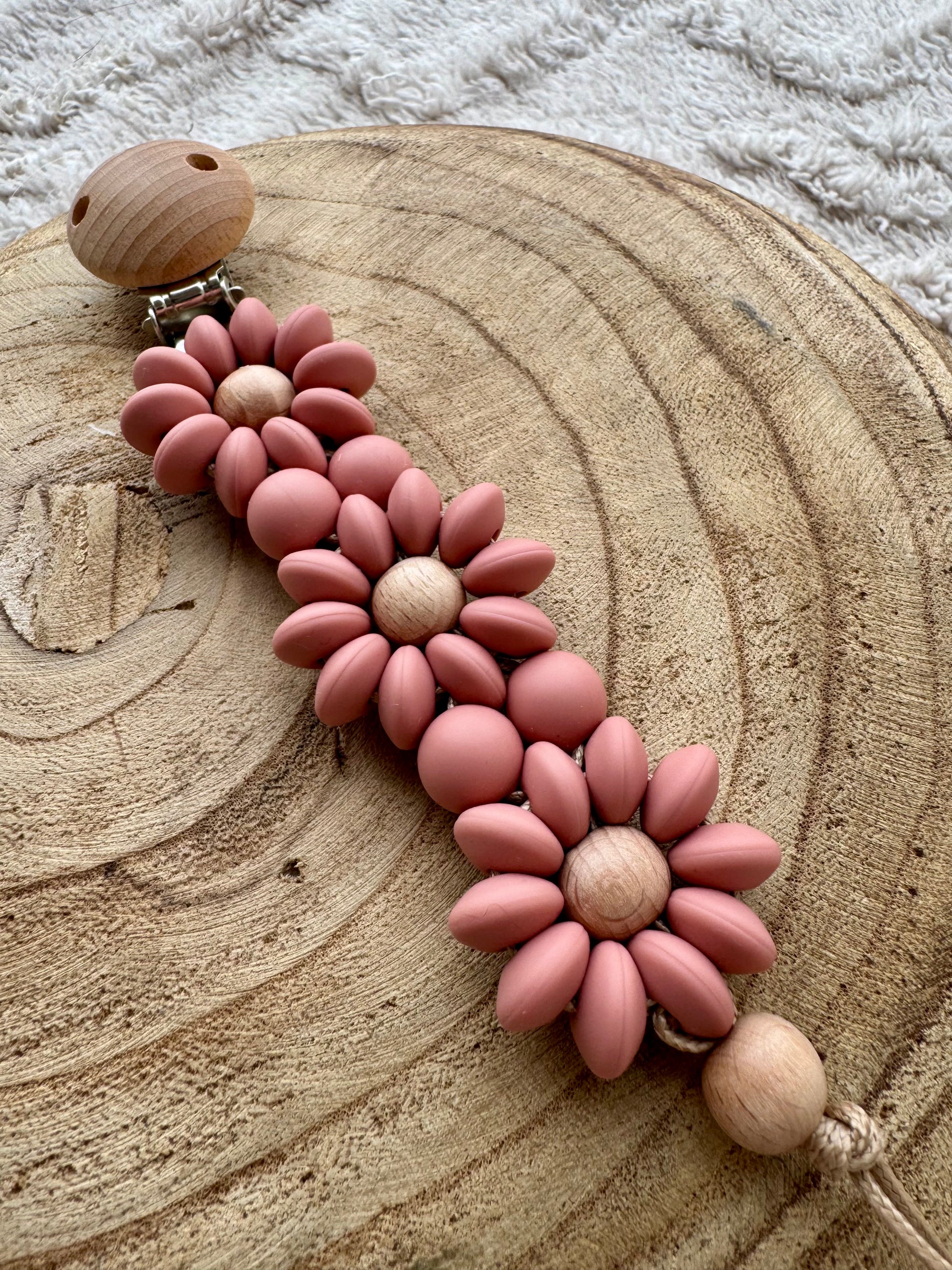Fabriqué avec des perles en silicone de haute qualité, ce modèle combine des perles plates ainsi que des perles en bois formant une fleur, créant une harmonie de formes et de couleurs qui captivent les sens.