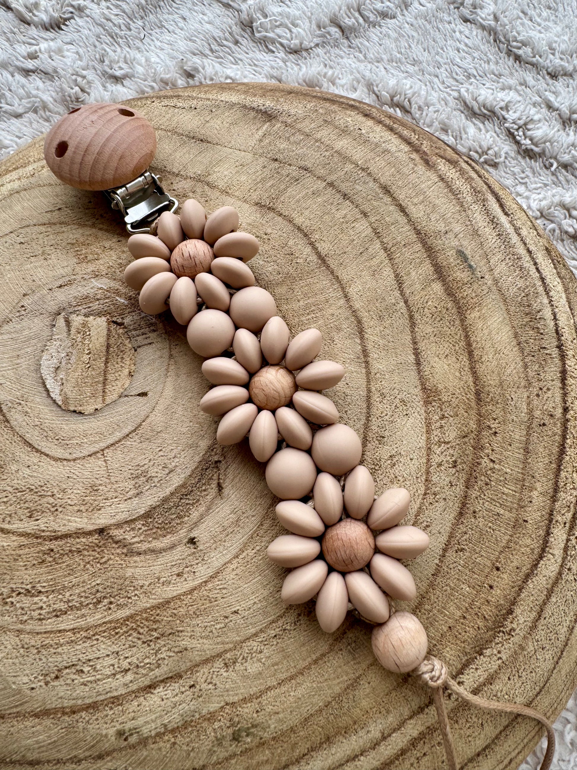 Fabriqué avec des perles en silicone de haute qualité, ce modèle combine des perles plates ainsi que des perles en bois formant une fleur, créant une harmonie de formes et de couleurs qui captivent les sens.