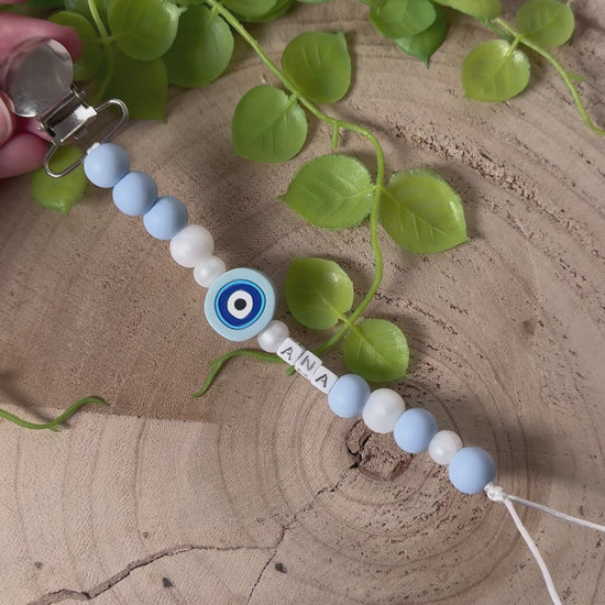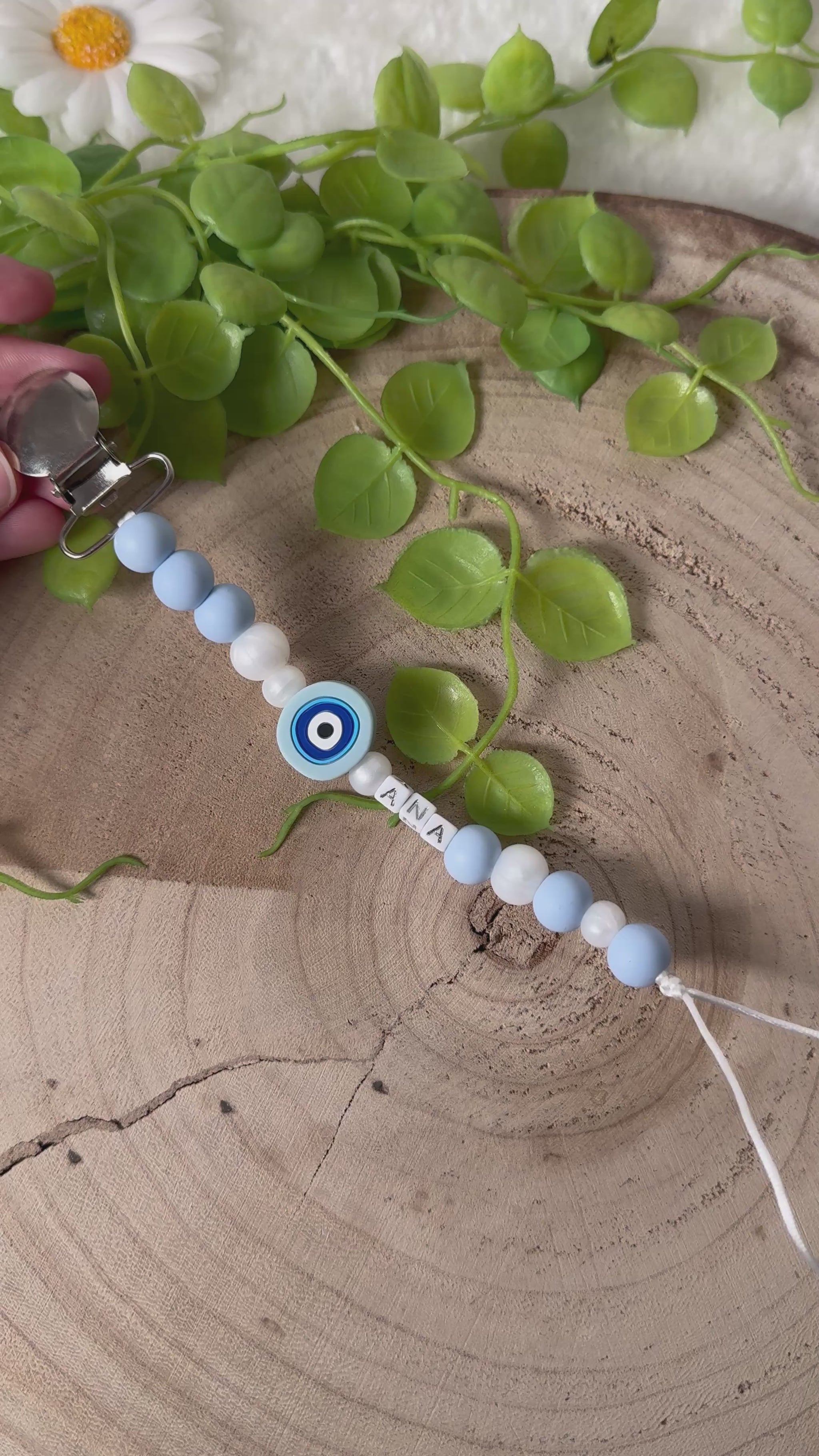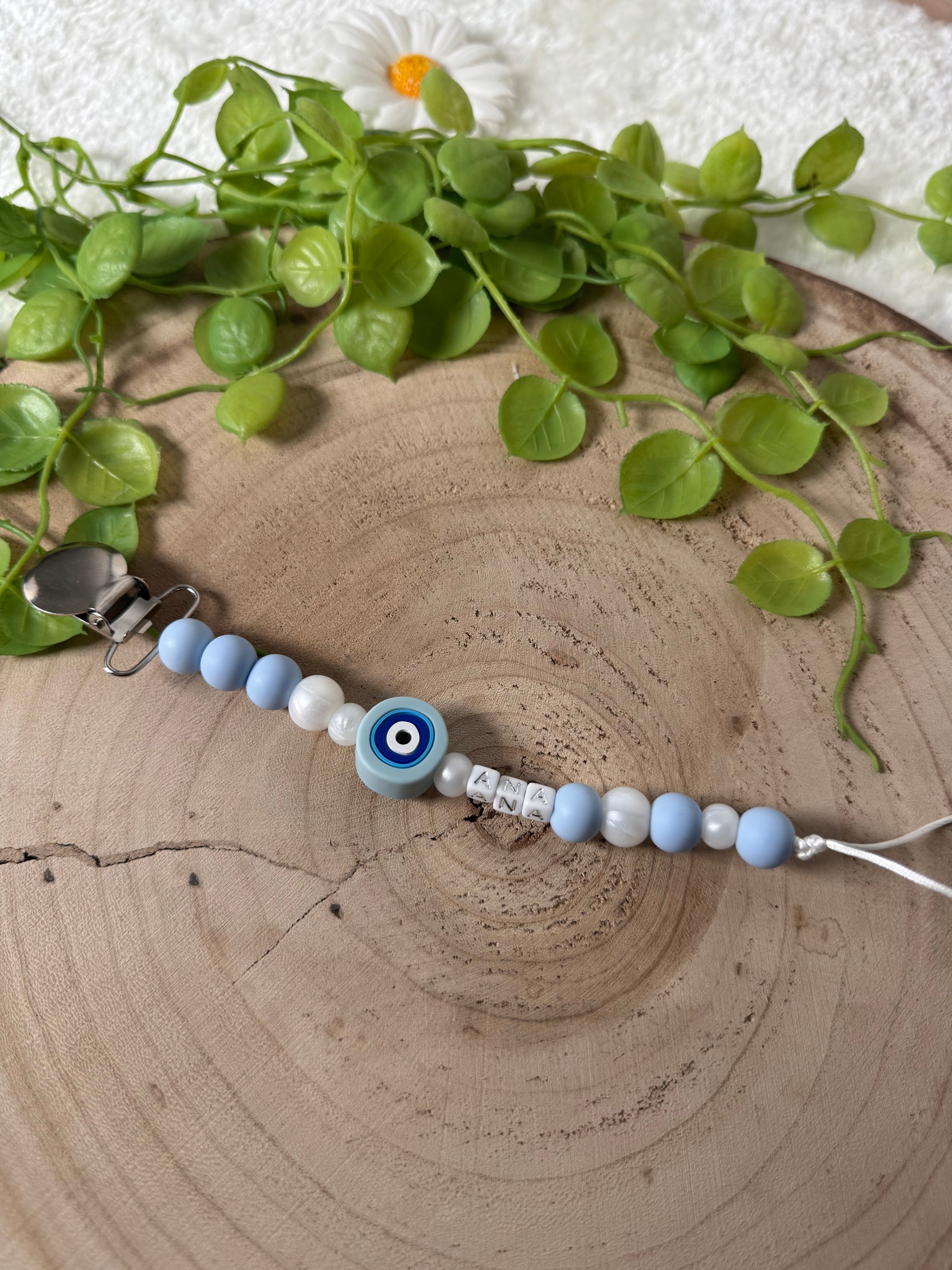 Fabriqué avec des perles en silicone de haute qualité, ce modèle marie de délicates perles bleues et nacrées à un petit oeil protecteur, pour une touche symbolique et pleine de douceur ♡