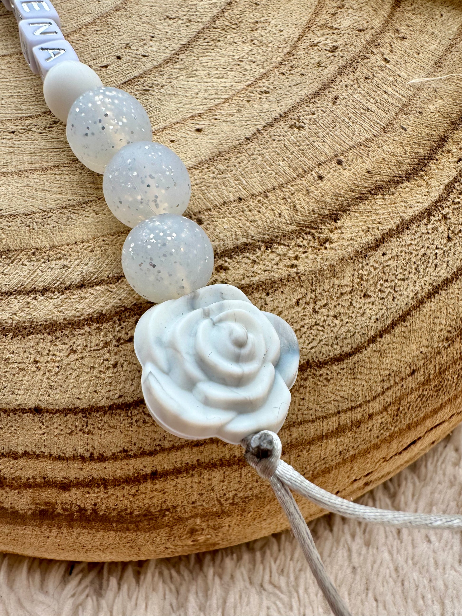 Conçue avec des perles en silicone souples et colorées, ornées de paillettes scintillantes, cet accessoire allie fonctionnalité et esthétique. La jolie fleur qui orne cet attache-tétine apporte une note de douceur et de charme, tandis que les paillettes ajoutent un effet lumineux et féerique.